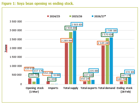 South Africa’s soya bean market has become increasingly well supplied over the past three marketing seasons. Total supply for the 2026/27 marketing year is estimated at approximately 2,97 million tons, supported by good local production and higher carry-over stocks. One of the most notable developments in the market is the rise in ending stocks and soya beans available for export. Ending stocks are also projected to increase from around 140 000 tons in the 2024/25 marketing year to approximately 370 000 tons by the end of the 2026/27 marketing year (28 Feb 2027). Over the same period, soya bean exports are expected to increase from roughly 150 000 tons to 235 000 tons, reflecting greater soya bean availability in the local market and the growing role of exports in balancing supply. Local demand continues to be driven primarily by the crushing industry, with roughly 2,2 million tons of soya beans processed annually into oil and oilcake. This highlights the importance of the livestock feed sector as the primary downstream user of soya bean protein. Figure 1 illustrates the change in South Africa’s soya bean balance, with increasing exports and higher ending stocks indicating better supply conditions in recent marketing years.