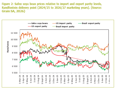 Prices have since declined and are currently trading closer to export parity levels at the start of the 2026/27 marketing year. With both production and carry-over stocks being higher, the local market is likely to rely on exports to balance supply. At the same time, ample global soya bean production, particularly from major producers such as Brazil and the United States, continues to limit upward price momentum. South African soya bean prices are expected to remain closely aligned with international oilseed market fundamentals